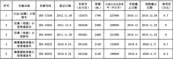 吉林省天池拍賣有限責(zé)任公司受長白山旅游股份有限公司的委托,對以下5臺(tái)公務(wù)用車進(jìn)行公開拍賣: