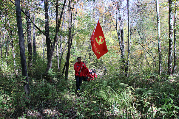 在隨風(fēng)飄揚(yáng)的黨旗下,全體黨員前往老黑河遺址,深入密林深處,崎嶇的山路,行走在山林草莽之間,感受當(dāng)時(shí)的艱苦斗爭(zhēng)環(huán)境,體驗(yàn)革命烈士走過的抗聯(lián)路。